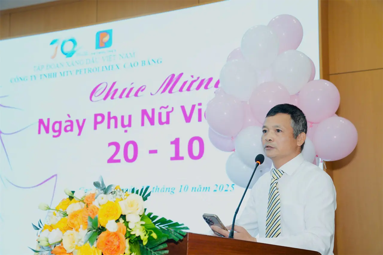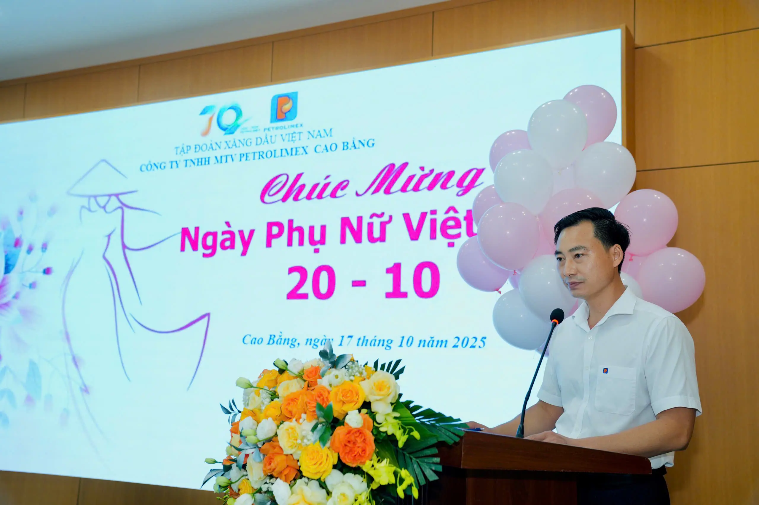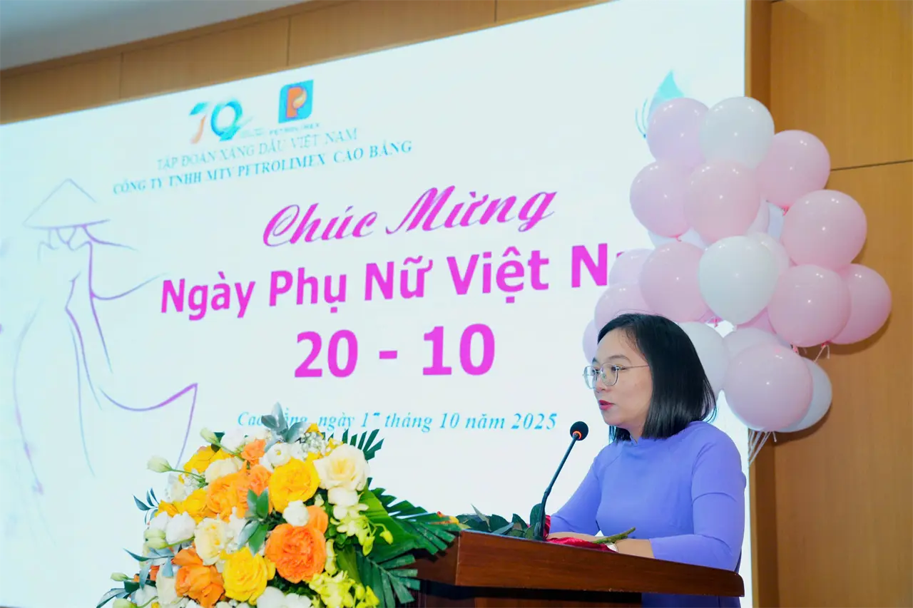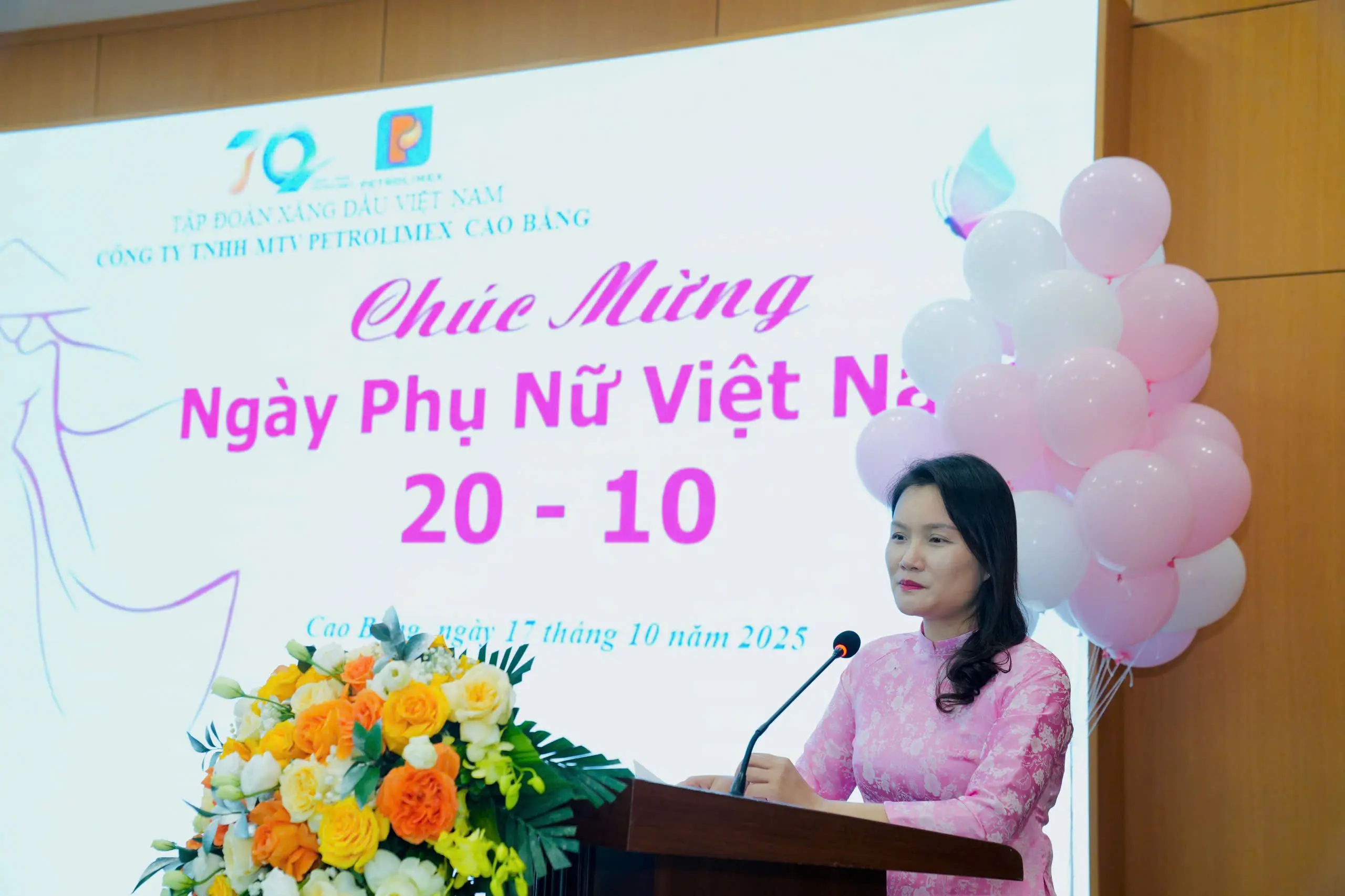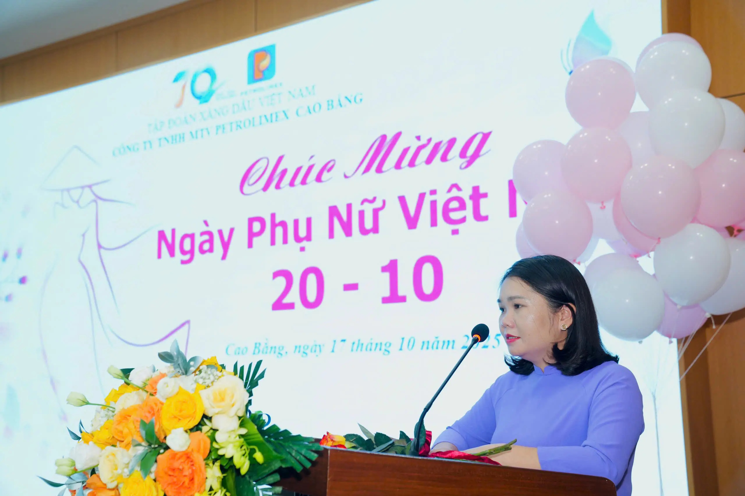 Phát biểu chúc mừng tại buổi lễ, bà Đàm Thị Bằng – Chủ tịch kiêm Giám đốc Công ty gửi lời tri ân và lời chúc mừng tốt đẹp nhất tới toàn thể nữ cán bộ, nhân viên nhân Ngày Phụ nữ Việt Nam 20/10. Bà ghi nhận và biểu dương tinh thần trách nhiệm, sự kiên cường, nỗ lực vượt khó của chị em trong giai đoạn vừa qua, đồng thời khẳng định vai trò quan trọng của phụ nữ trong việc duy trì ổn định và phát triển hoạt động của Công ty. “Dù trải qua nhiều khó khăn do thiên tai, các chị em vẫn luôn giữ vững tinh thần lạc quan, tận tụy với công việc và chu toàn cuộc sống gia đình – là niềm tự hào của tập thể Petrolimex Cao Bằng,” bà nhấn mạnh.
