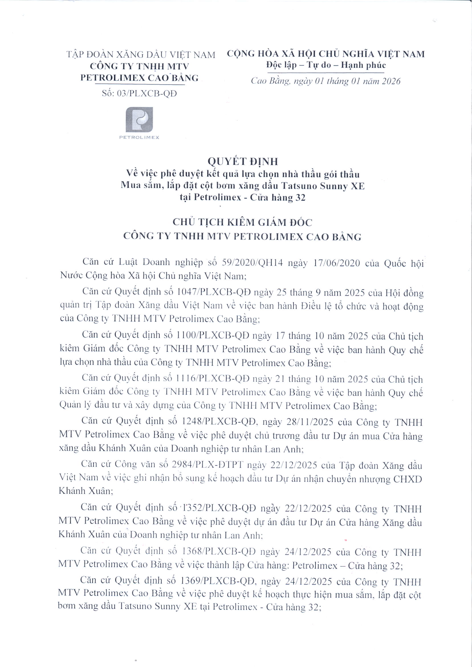 Quyết định về việc phê duyệt kết quả lựa chọn nhà thầu gói thầu Mua sắm, lắp đặt cột bơm xăng dầu Tatsuno Sunny XE tại Petrolimex - Cửa hàng 32